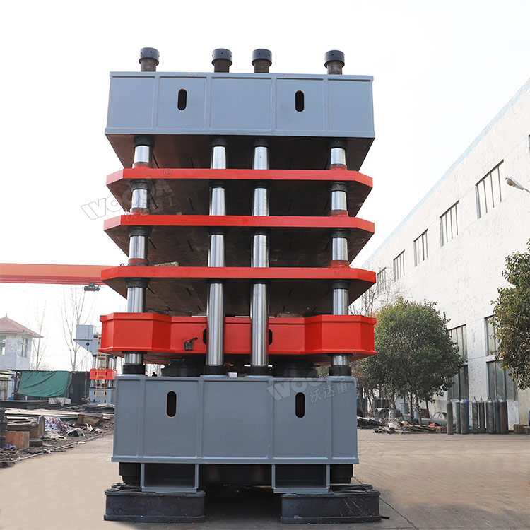 2000噸密封圈熱壓機是山東沃達重工在常規(guī)2000噸三梁四柱液壓機的基礎(chǔ)上,增加了三層實心鋼板橫梁和4根側(cè)方立柱,使液壓機的工作臺變?yōu)?層,可以同時壓制4層密封圈,大工作臺3700mm*2850mm,采用6個油缸設(shè)計,包含4個主油缸和2個輔助油缸,受力均勻,保證產(chǎn)品質(zhì)量。